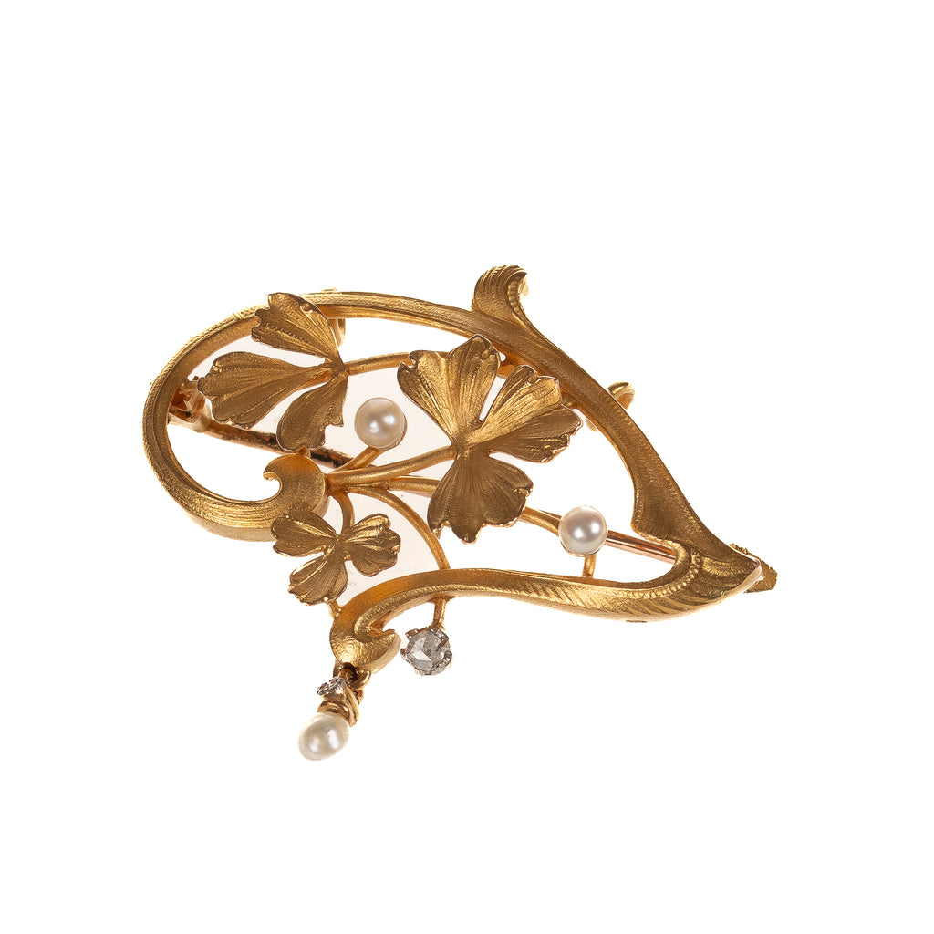 florale Jugendstil Brosche Gold 750 mit Perlen & Diamant Paris um 1900 (D3538)