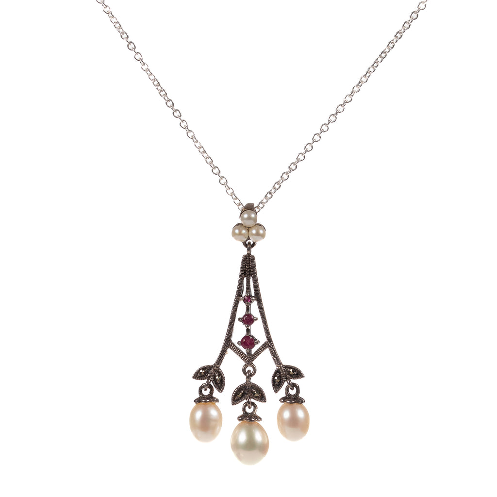 Jugendstil Anhänger mit Kette Silber 925 Rubine, Markasiten & Perlen (D3549)
