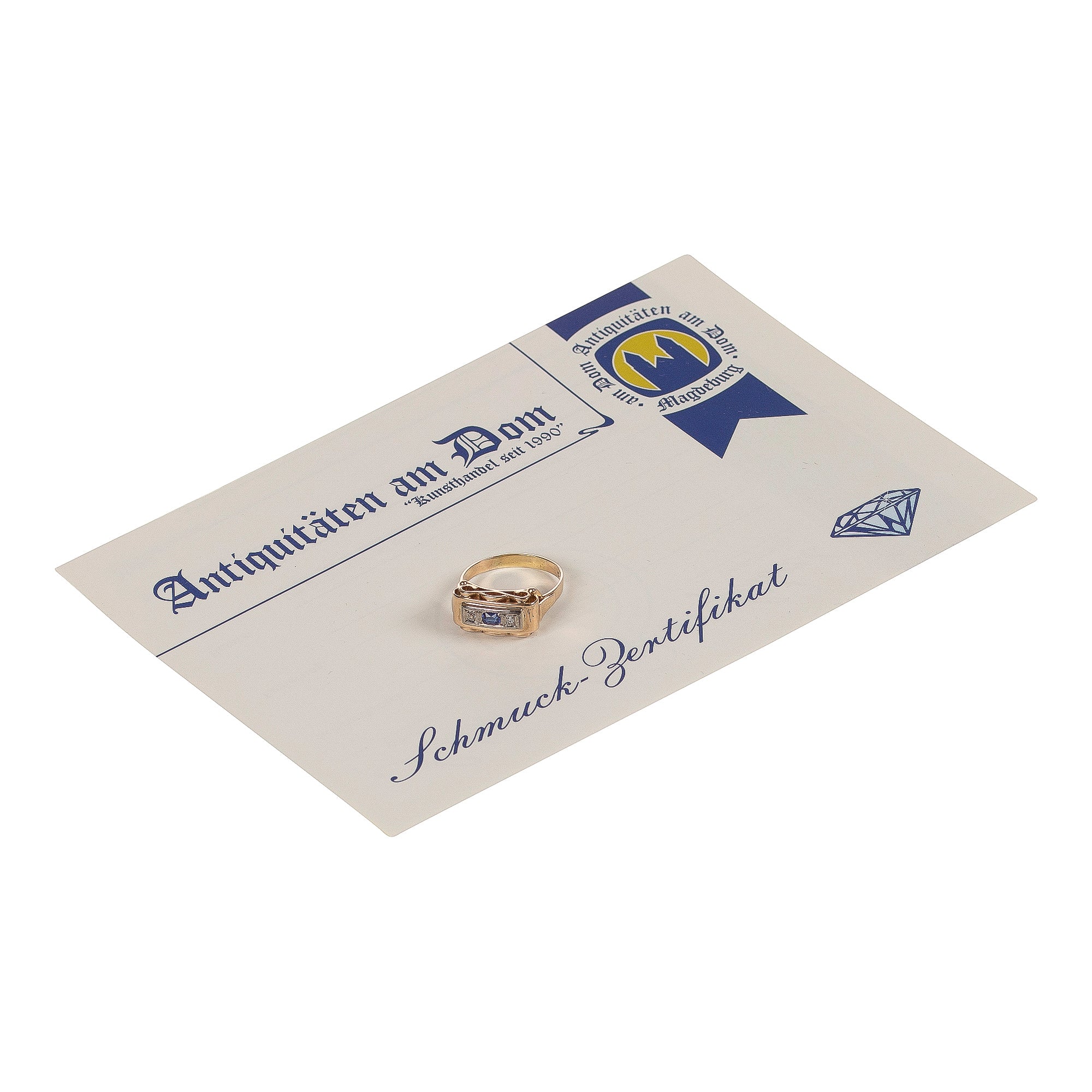 - mit Saphir (3,7 x 2,6 mm) und zwei kleinen Altschliff - Diamanten (zus. ca. 0,02 ct.)